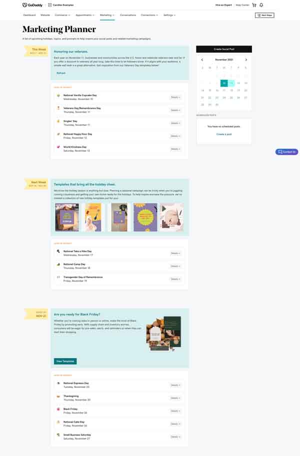 To access the Marketing Planner, click on the “Marketing” tab in the GoDaddy dashboard. This will bring up a list of options. The Marketing Planner is the second item on your list. From this dash, you can view a calendar that highlights important dates and helps you plan and create social media posts.