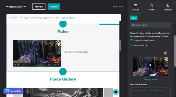 Uploading videos and pictures can be accomplished by clicking “change video.” Users can upload their own videos or choose from free, pre-edited content from GoDaddy.