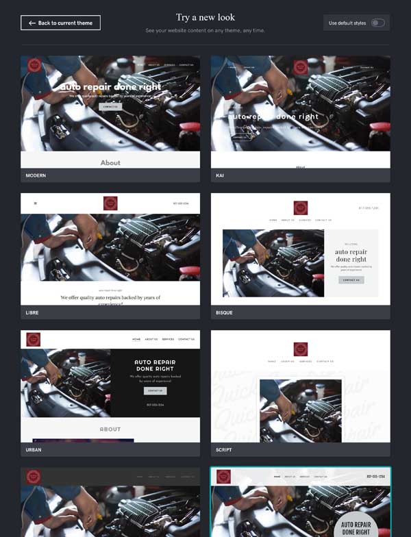 To get started building your website, you will want to select a theme, then you can easily upload images, such as photos of your products and business, to personalize your site. Not sure if the theme you chose is best? No problem. By simply clicking on the “Try a new look” button, GoDaddy will provide a list of available themes with your content displayed in them, like this: