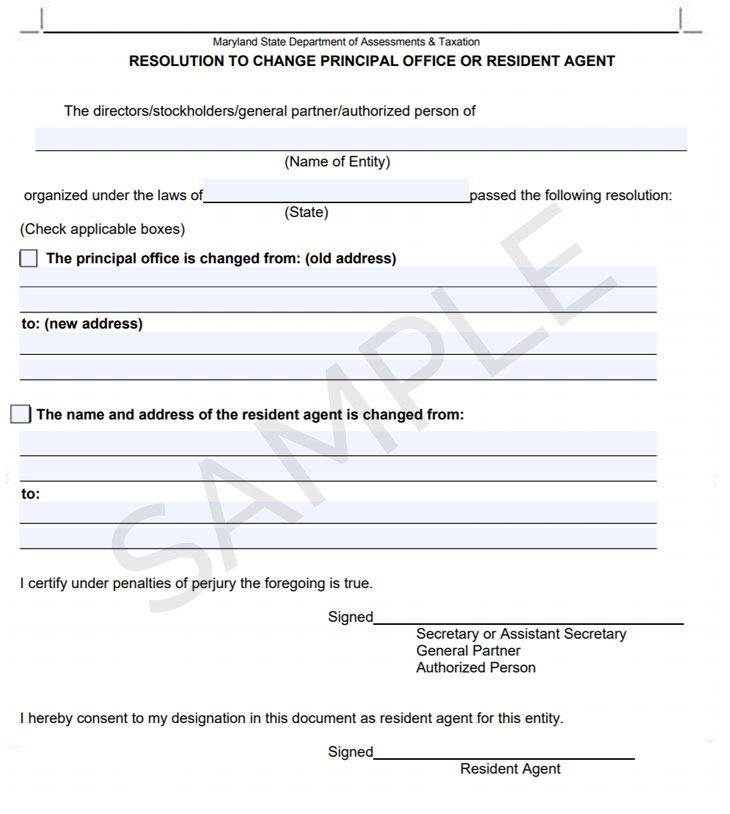 If you want to appoint a new resident agent, you will need to file a Resolution to Change Principal Office or Resident Agent form with the Maryland Department of Assessments & Taxation alongside a $25 filing fee.