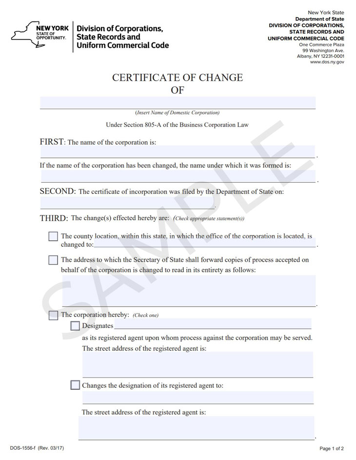 In order to change your registered agent in New York, you will need to fill out a Certificate of Change form and file it with the New York Department of State’s Division of Corporations, State Records, and Uniform Commercial Code.