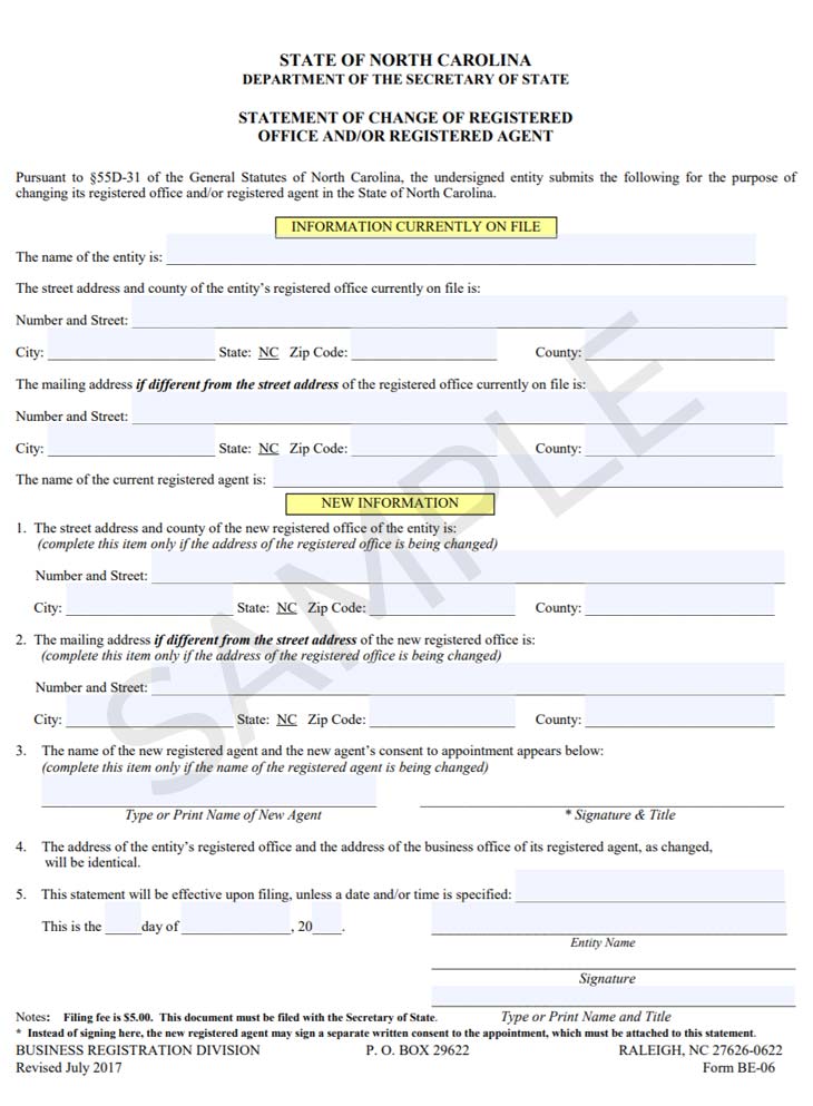 In order to change your registered agent in North Carolina, you will need to submit Form BE-06: Statement of Change of Registered Office and/or Registered Agent through the Secretary of State for $5. Keep in mind that you will need your new agent’s written consent.
