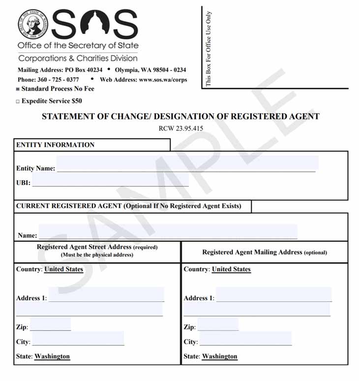 To change your registered agent in Washington, you will need to fill out a Statement of Change form and submit it to the Office of the Secretary of State.